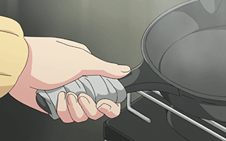 驚いたあおいが油断して、熱くなったスキレットの取っ手を触ってしまう。